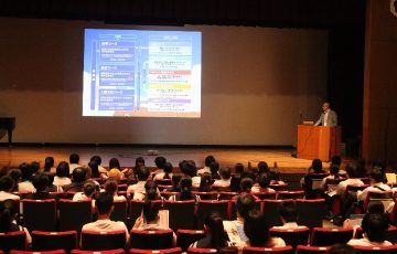 まず、記念館ホールで全体会が開かれ、音楽科在校生によるモーニングコンサートの後、本校の概要説明ならびに学校生活の様子をまとめた動画の上映、入試についての説明などを行いました。