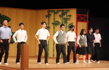 その後、本校3年生の代表生徒たちが登壇し、狂言の世界に触れるための「狂言ワークショップ」が開かれました。