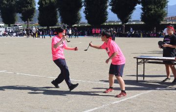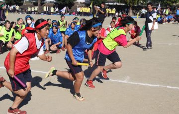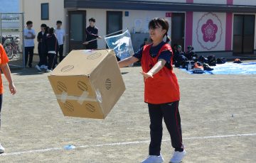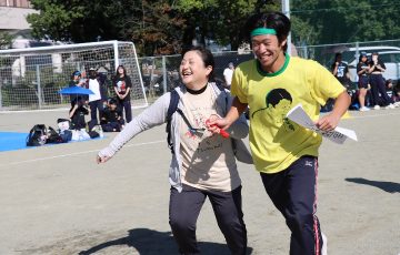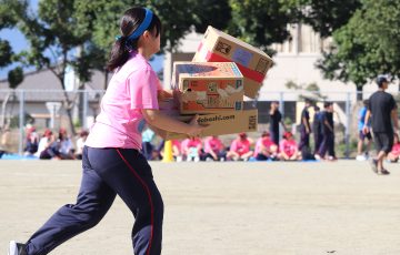 まず行われたのは、障害物リレー。クラス代表4人が、ダンボールを積み重ねて運んだり、二人三脚やなわとび、麻袋などで進むなど、なかなか思うようにならないリレーを戦いました。今年からは4走目に「借り物競争」が新設され、例年以上の盛り上がりとなりました。