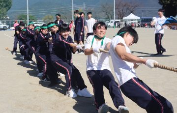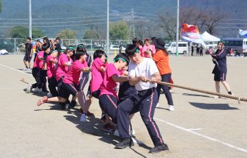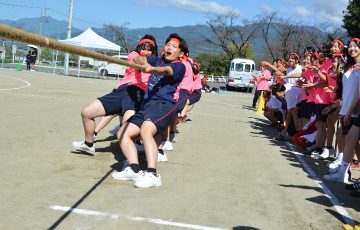 次に行われたのは綱引き。各クラス12人が力を合わせて、力いっぱいつなを引き合いました。