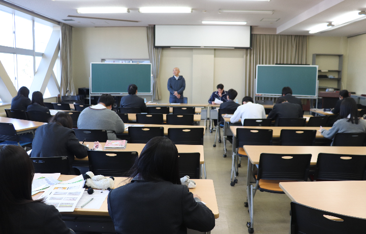 進学希望の生徒たちは、県内外から来校いただいた20校を超える大学・短期大学・専門学校の先生方から50分ずつ、合わせて2校の説明を受けました。1つひとつの学校の担当者の方から、学部・学科の特徴や取得可能な資格、求められる人物像をはじめとした各校の特徴についての説明を熱心に聞いていました。