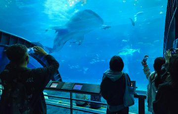 世界最大級の水槽「黒潮の海」では、ジンベエザメやマンタが悠々と泳ぐ姿を見ることができ、沖縄の豊かな海の生きものや自然の魅力を学びました。
