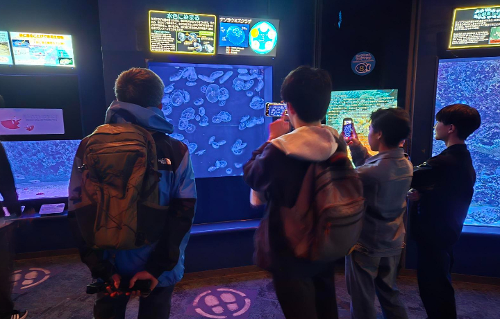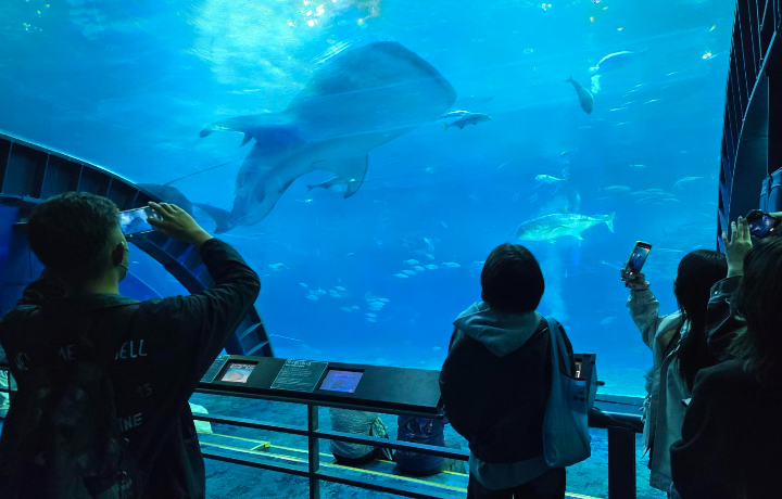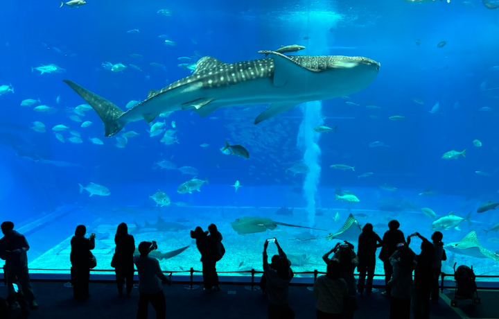 世界最大級の水槽「黒潮の海」では、ジンベエザメやマンタが悠々と泳ぐ姿を見ることができ、沖縄の豊かな海の生きものや自然の魅力を学びました。