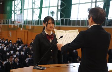 続いて、生徒会活動での顕著な活躍が見られた生徒に贈られる「生徒会功労賞」の表彰も行われ、受賞者を代表して、生徒会長を務めた今村心美さんに賞状が伝達されました。