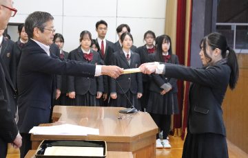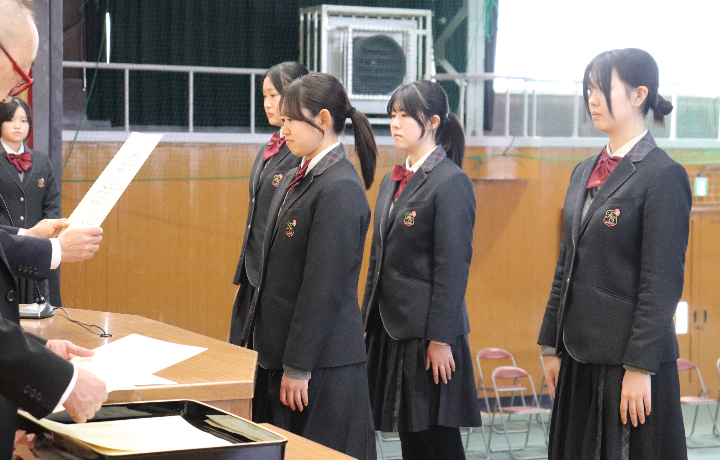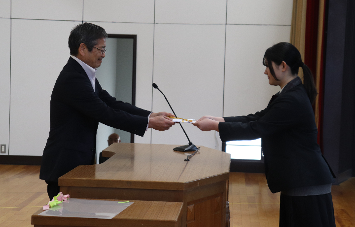 続いて、生徒会活動での顕著な活躍が見られた生徒に贈られる「生徒会功労賞」の表彰も行われ、受賞者を代表して、生徒会長を務めた今村心美さんに賞状が伝達されました。