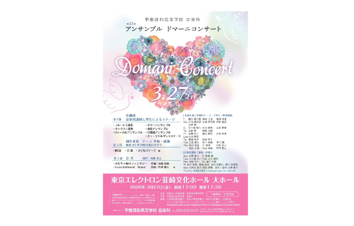 3月27日(金)に、本校音楽科で管楽器を専攻する仲間を中心に発足したアンサンブルグループ「DOMANI」が、「第11回 DOMANI Concert 2026」を東京エレクトロン韮崎文化ホール・大ホールで開催します。【17:00開場、17:30開演、入場無料全席自由】