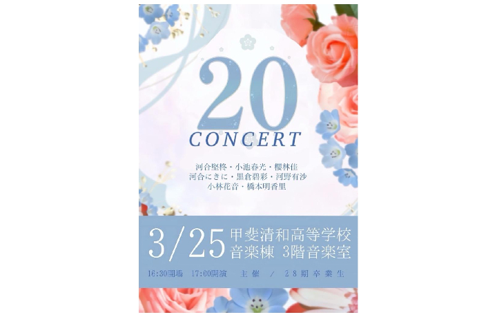 音楽科28期生による「20th Concert」が開催されます。 お知らせ2026.03.11 2年前に本校音楽科を卒業した28期生8人が、20歳という節目を記念して企画した「20th Concert」通称「20歳のコンサート」が、3月25日(水)に本校3F音楽室で開かれます。【16:30開場、17:00開演、入場無料全席自由】 ダウンロード 音楽科で過ごした日々を礎に、20歳を迎えた卒業生たちが届ける特別なステージです。多くの皆さまのご来場を、心よりお待ちしております。 ご家族、ご友人お誘いあわせの上、お気軽にご来場ください。